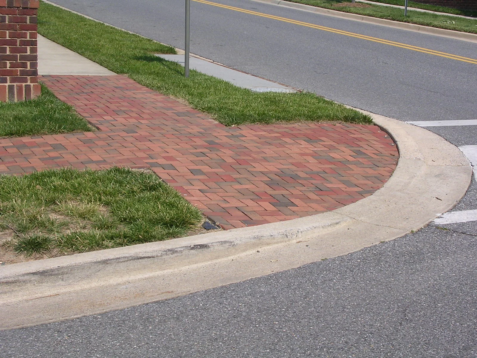 Many intersections have been engineered for the convenience of large vehicles without much thought given to pedestrians. An intersection that has curbs with a wide turning radius will encourage drivers of cars and trucks to travel through the intersection quickly – sometimes telegraphing that a yield is okay when really a full stop is needed. The turning radius of the curb pictured below is 54 feet; a turning radius of 16 feet would have been ample.